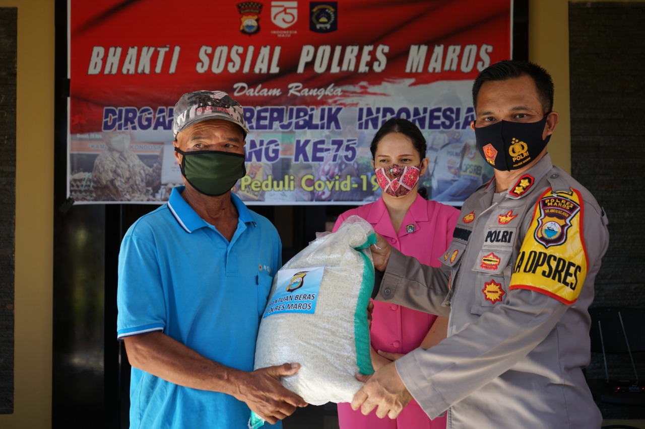 Jelang HUT RI ke-75, Polres Maros Bagikan Beras untuk Warga Terdampak Covid