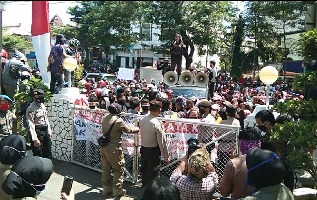 SULSELBERITA.COM. Makassar,  — Sekitar 1000 orang massa dari berbagai elemen pekerja parawisata membanjiri Balaikota Makassar, Kamis (13/8/2020).