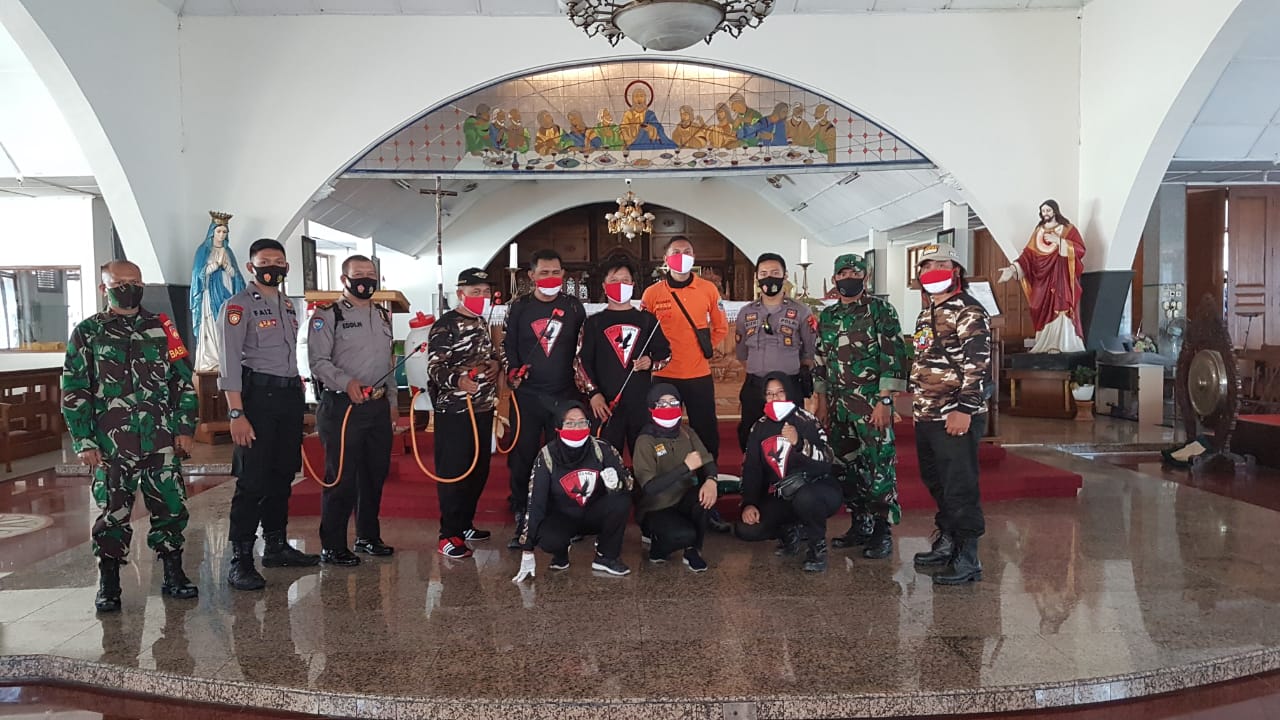 “Kita bersama-sama dengan para pembina dari TNI POLRI saling bersinergi melaksanakan pembersihan sekitar tempat ibadah dan penyemprotan Desifektan.