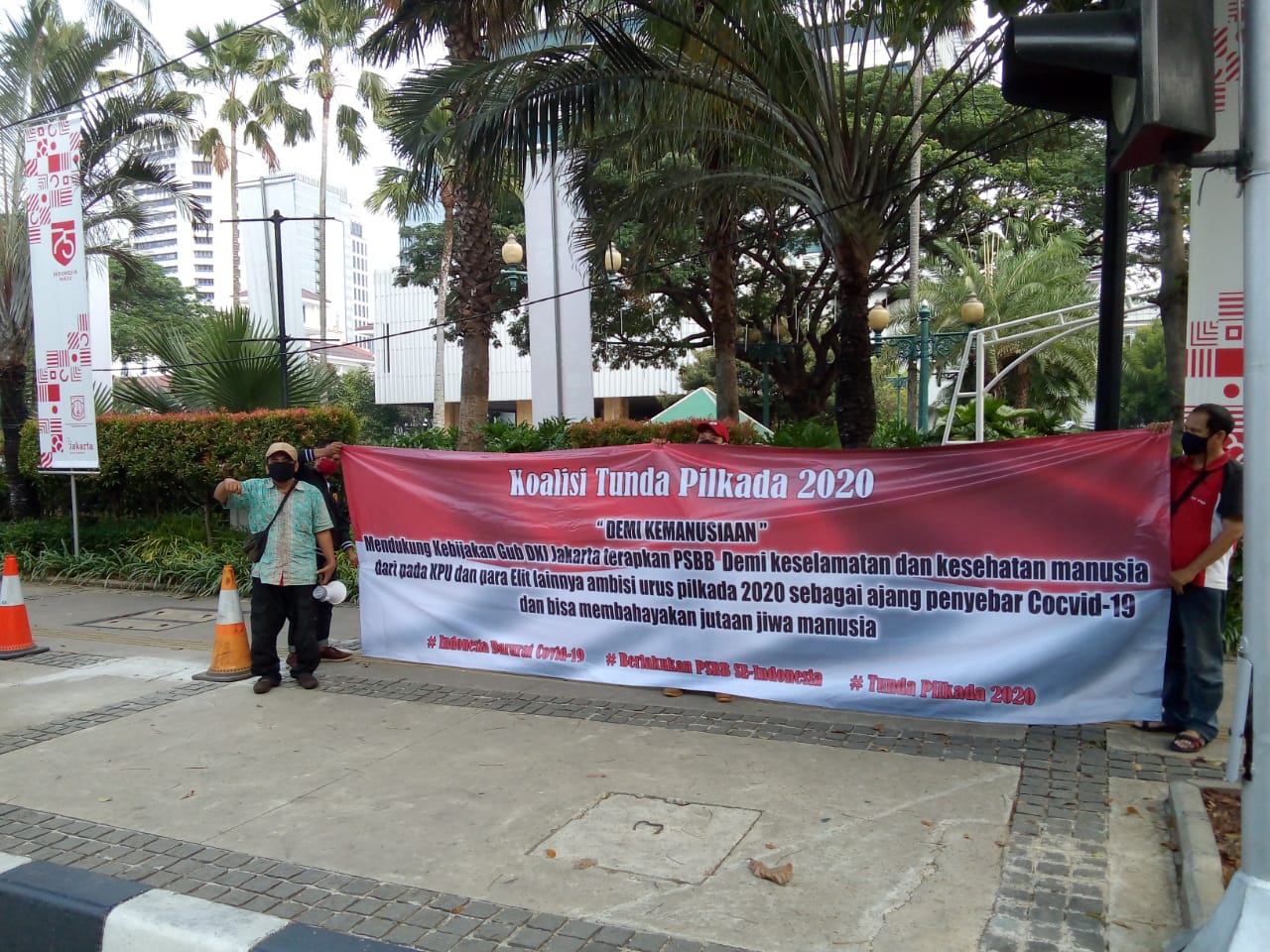“Kami Koalisi Tunda Pilkada 2020, menggelar aksi ini di depan Gedung Balai Kota DKI Jakarta, tidak lain hanya  demi kemanusiaan dan Hak Asasi Manusia (HAM). Kami mendukung kebijakan GUB DKI Jakarta dalam menerapkan PSBB demi keselamatan umat manusia,” kata Ichwan Harahap Kordinator Aksi Koalisi Tunda Pilkada 2020.