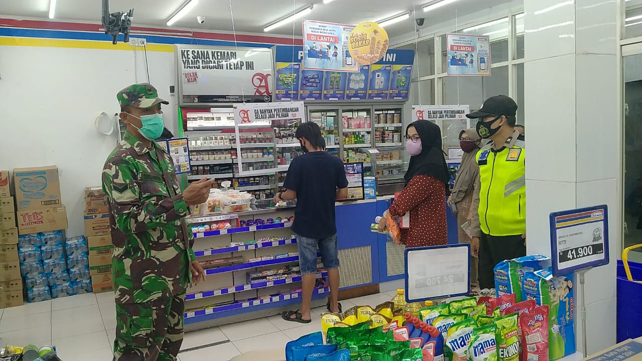SULSELBERITA.COM. Boyolali. Tekan penyebaran Virus Corona, Kodim 0724/Boyolali melalui Babinsa Sawahan Koramil 11/Ngemplak Sertu Sugianto melaksanakan patroli wilayah gabungan dengan Polsek Ngemplak di tempat perbelanjaan swalayan yang ada di Desa Sawahan Kecamatan Ngemplak Kabupaten Boyolali. Selasa Malam (15/09).