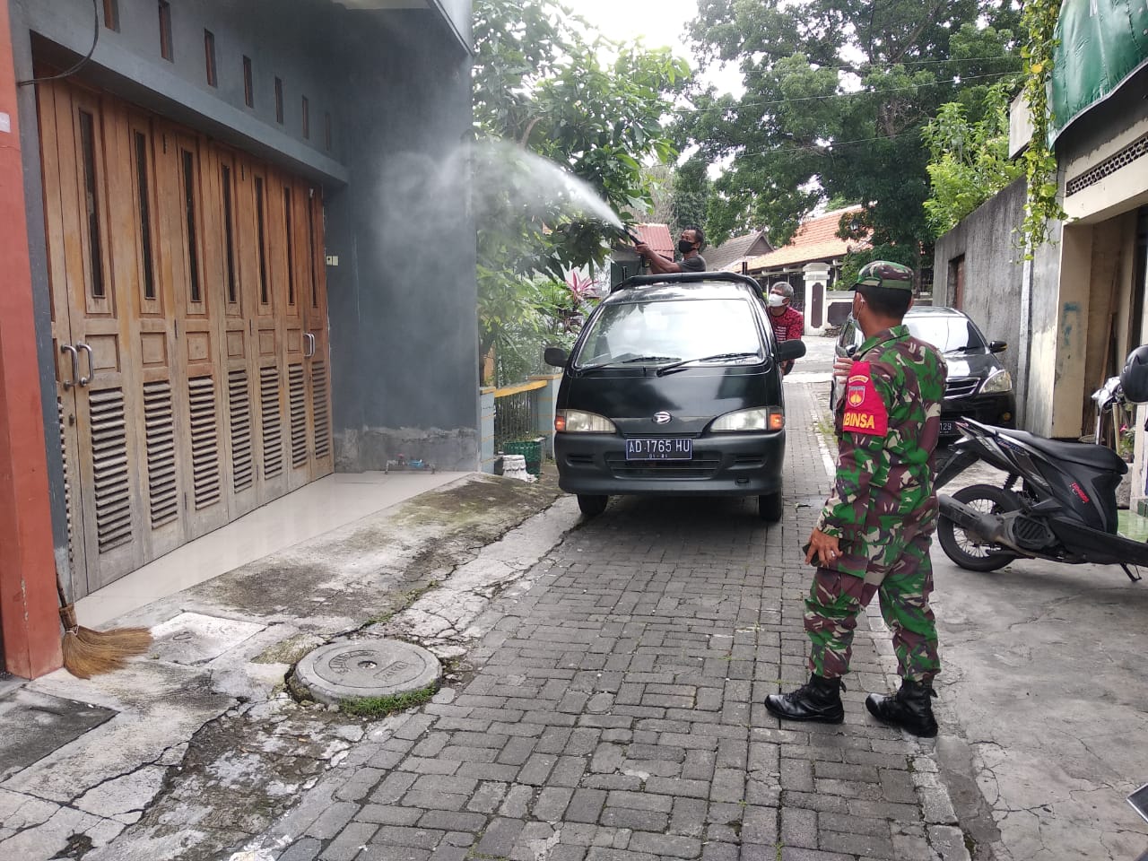 SULSELBERITA.COM. Surakarta – Babinsa Kelurahan Mojosongo Koramil 04/Jebres Kodim 0735 Surakarta Sertu Aswan Ahiri membantu kegiatan penyemprotan disinfektan di wilayah Mojosongo Kecamatan Jebres. Sabtu, (16/1/2021) pukul 09:00 wib s.d. selesai.