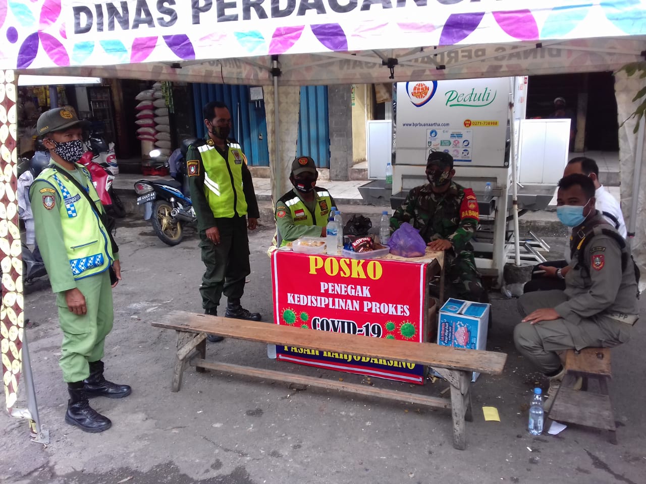 Dengan berkaitan itu Babinsa Kelurahan Danukusuman Koramil 03/Serengan Kodim 0735/Surakarta Sertu Priyanto bersama Petugas Pos Covid-19 melaksanakan penyemprotan disinfektan di Pasar Hardjodaksino Jln. Gatot Subroto Danukusuman Kecamatan Serengan Kota Surakarta, (Sabtu Sore 06/02)