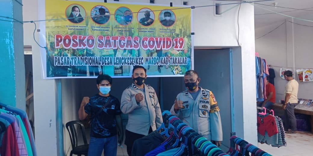 Pada Kesempatan tersebut, personil polsek marbo siaga penuh di posko Penanganan Covid-19 di dalam area pasar yang didirikan oleh team satgas penanganan Covid-19 dari pihak kepolisian di bantu dari tenaga kesehatan serta pemerintah desa lengkese
