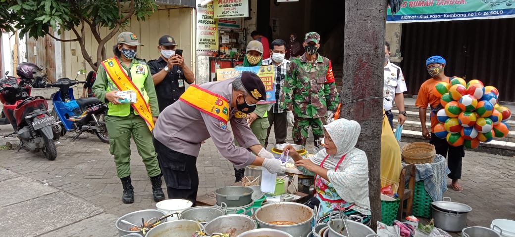 Sinergitas TNI-POLRI Dan Linmas Surakarta Laksanakan Penerapan Protkes Dan Kegiatan PPKM di Pasar Kembang