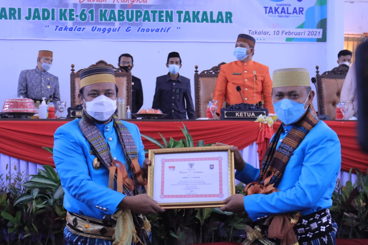Karena masih dalam suasana pandemi Covid-19. Sehingga Mendagri menyerahkannya melalui Pemerintah Provinsi Sulawesi Selatan dalam hal ini Wakil Gubernur Prov. SulSel Andi Sudirman Sulaiman,ST saat menghadiri Peringatan Hari Jadi Kabupaten Takalar ke 61 yang diterima langsung oleh Bupati Takalar H. Syamsari,S.Pt.MM yang berlangsung di Ruang Rapat paripurna Lantai II kantor DPRD kabupaten Takalar. Rabu (10/2/2021) siang.