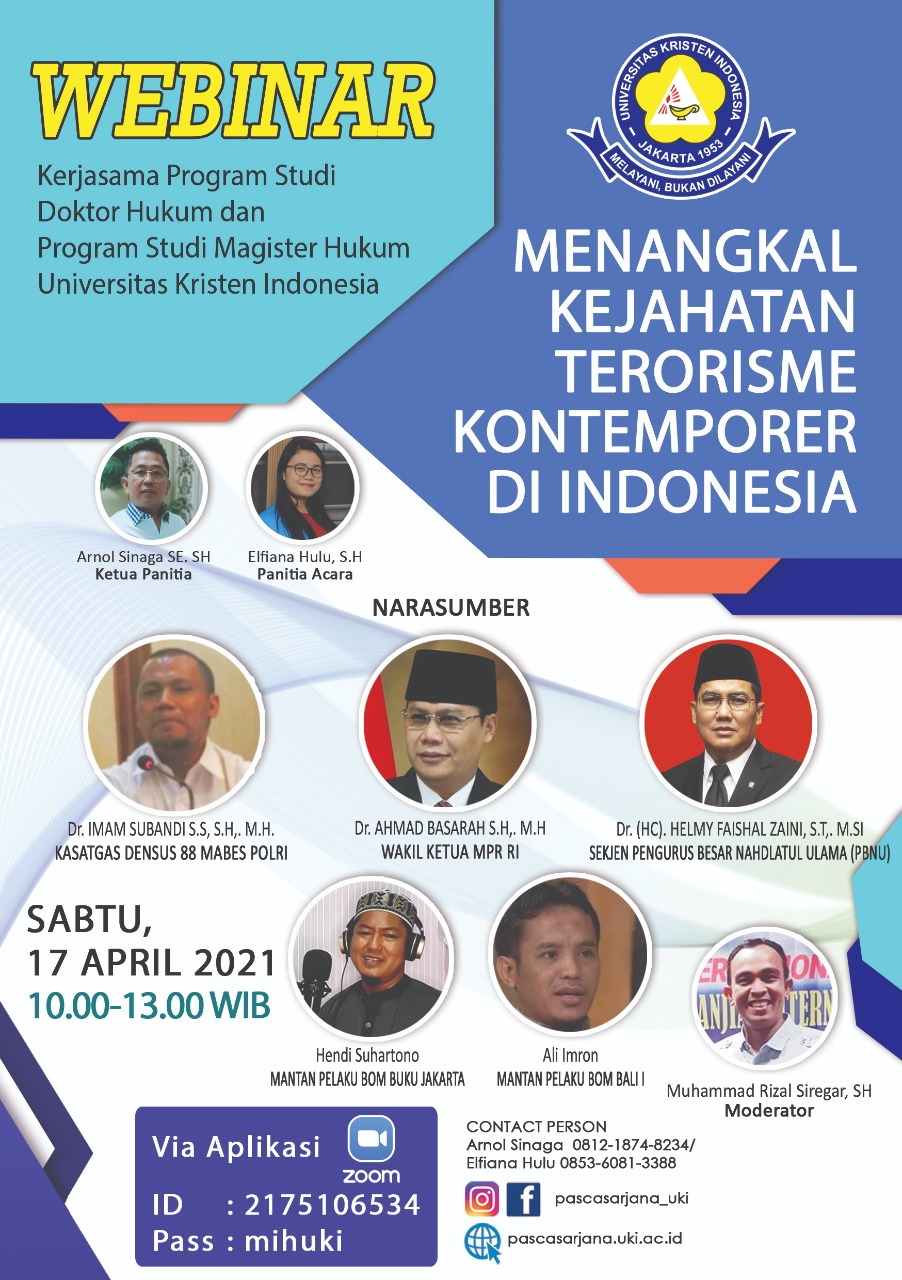Program Studi Magister Hukum 2020 dan Doktor Hukum Pascasarjana UKI Menggelar Webinar 'Menangkal Kejahatan Terorisme Kontemporer di Indonesia'