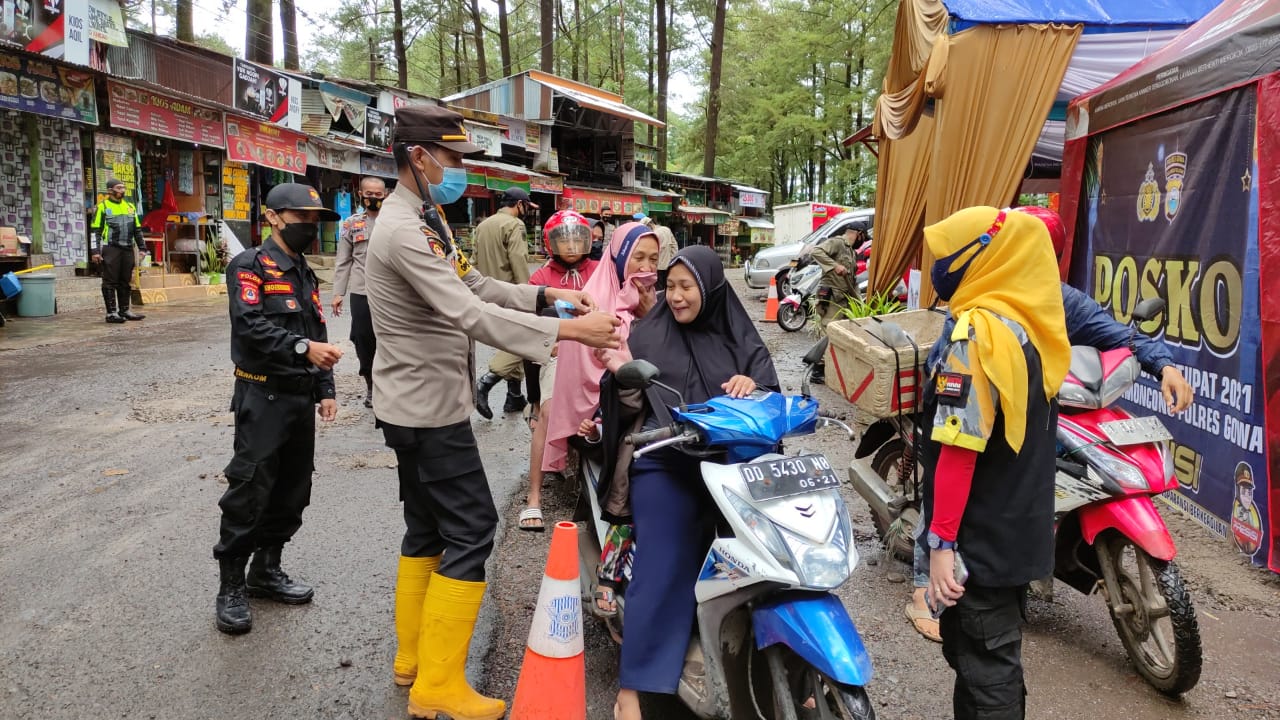 Kapolsek Tinggimoncong Polres Gowa IPTU Hasan Fadhlyh SH selaku Perwira penanggung jawab Posko ketupat rest area hutan pinus Malino memimpin langsung saat memberikan himbauan tentang penggunaan masker.