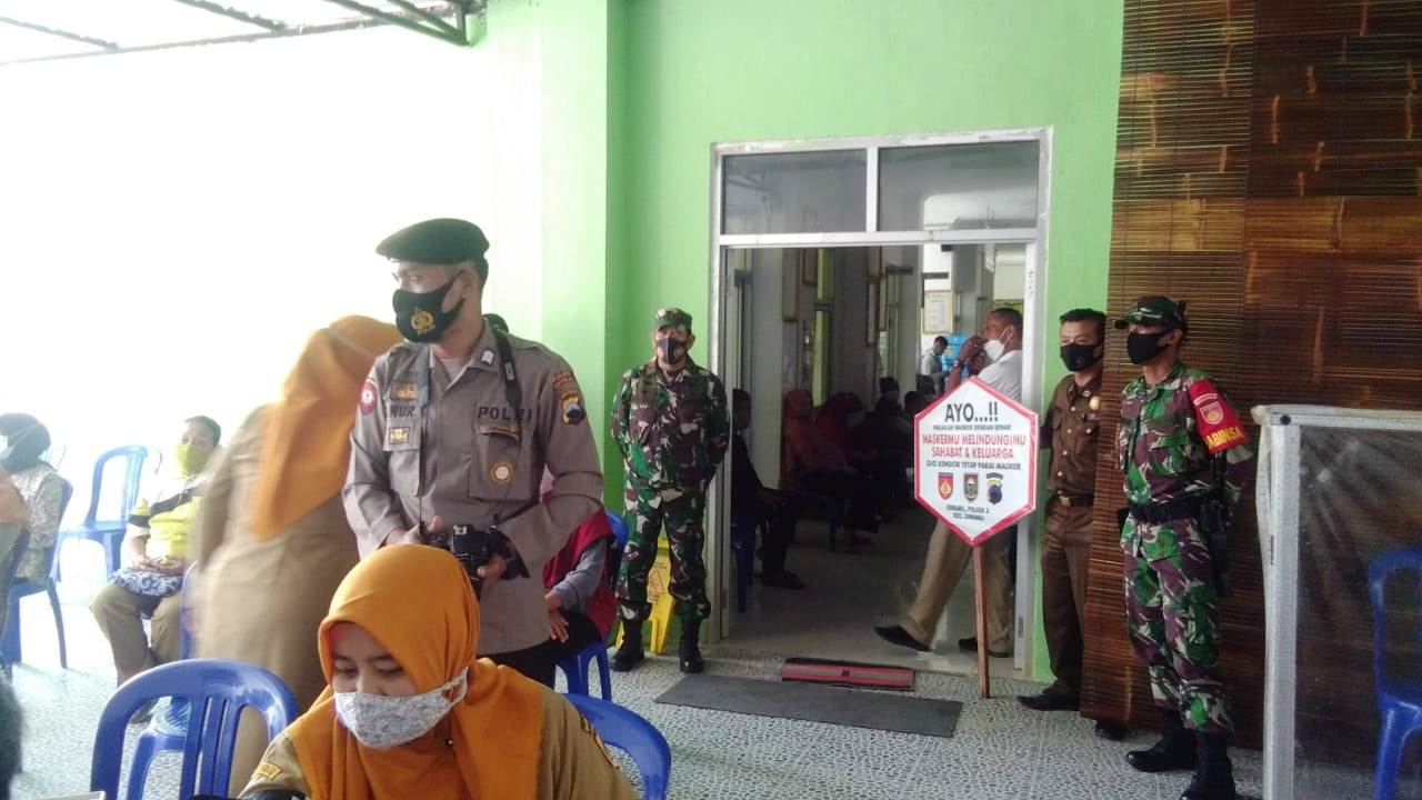 SULSELBERITA.COM. Boyolali. Danramil 19 Juwangi Kodim 0724/Boyolali Lettu Inf Sukarmo beserta anggota Satgas Covid 19 Kecamatan Juwangi mendampingi Vaksinasi Covid-19 tahap 1 terhadap Guru SMA /SMK N Juwangi di Puskesmas Kecamatan Juwangi, Kabupaten Boyolali. Selasa (11/05).