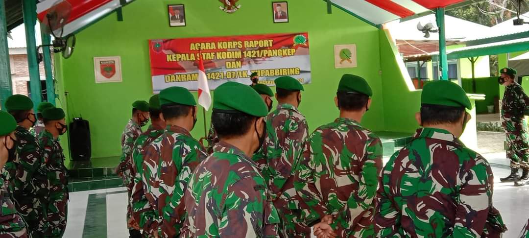 SULSELBERITA.COM.Pangkep — Sekaitan dengan Kepala Staf Kodim 1421 Pangkep sebagai warga Baru di Kodim 1421 Pangkep dan Pengangkatan Pejabat Komandan Koramil 1421-07/Lk.Tupabbiring Kodim 1421 Pangkep gelar Acara Tradisi Korp Raport yang dilaksanakan di Aula Makodim 1421 Pangkep Jln. M. Arsyad B. Kel.Paddoang Doangan Kec. Pangkajene Kab. Pangkep. (Selasa,11/05/2021)