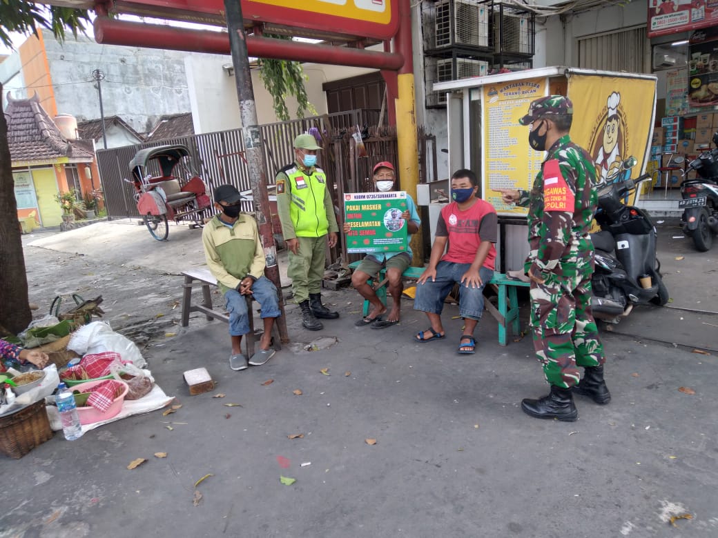 SULSELBERITA.COM. Surakarta- Sebagai upaya keberlanjutan untuk mengugah peningkatan kedisiplinan masyarakat dalam penerapan Protokol Kesehatan (Prokes), Bintara Tinggi Komunikasi Sosial (Bati Komsos) Koramil 03 Serengan Kodim 0735 Surakarta Pelda Tukiman dan Linmas menggelar Patroli Dialogis Monitoring, Sosialisasi dan Edukasi penerapan disiplin Protokol Kesehatan Cegah Covid-19. Kegiatan ini menyasar Alfa Mart Serengan Kota Surakarta,(14/5).