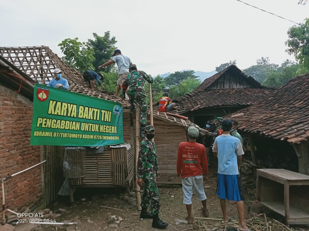 SULSELBERITA.COM. Wonogiri – Anggota Koramil 07/Tirtomoyo yang dipimpin langsung oleh Danramil Kapten Cba Suparna, bersama masyarakat Dusun Cabakan, Desa Banyakprodo, melaksanakan karya bakti membantu rehab rumah warga yang tidak layak huni, Rabu(26/5).
