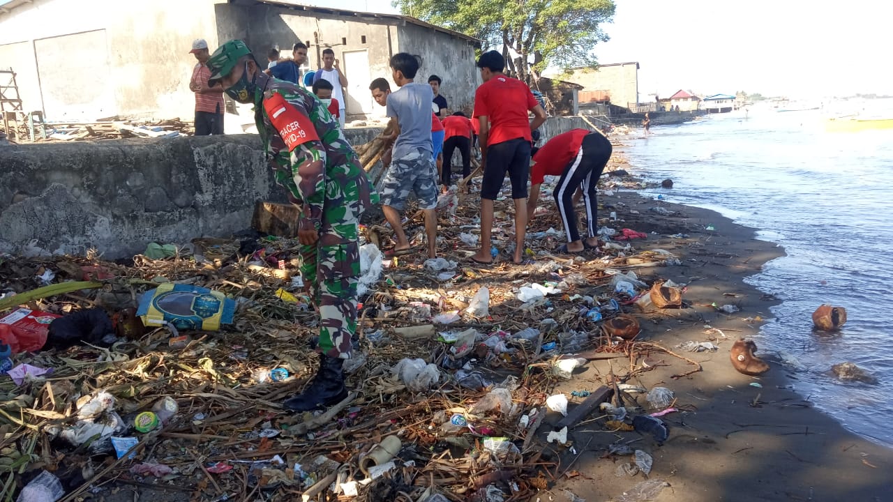 SULSELBERITA.COM. Takalar – Babinsa Koramil 1426-04/Galsel, Jajaran Kodim 1426/Takalar Sertu Abd Salam bersama Mahasiswa Poltekkes Makassar dan masyarakat Desa Pa’lalakang, Kecamatan Galesong, Kabupaten Takalar, melaksanakan kegiatan Kerja Bakti membersihkan sampah plastik yang ada di pinggir pantai, Jum’at, (28/5/2021) pagi.