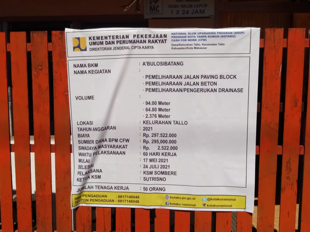 SULSELBERITA.COM.Makassar – Diduga anggaran pengerjaan proyek pemeliharaan dari Program Kota Tanpa Kumuh (KOTAKU) di Kelurahan Tallo banyak penyimpangan dan siasat jahat oknum Badan Keswadayaan Masyarakatan (BKM) dan Ketua Kelompok Swadaya Masyarakat (KSM).