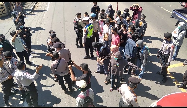 Terlihat aparat kepolisian berjaga-jaga di lokasi aksi dan massa memblokade jalan sembari membentangkan petaka aksi yang bertuliskan sejumlah tuntutan.