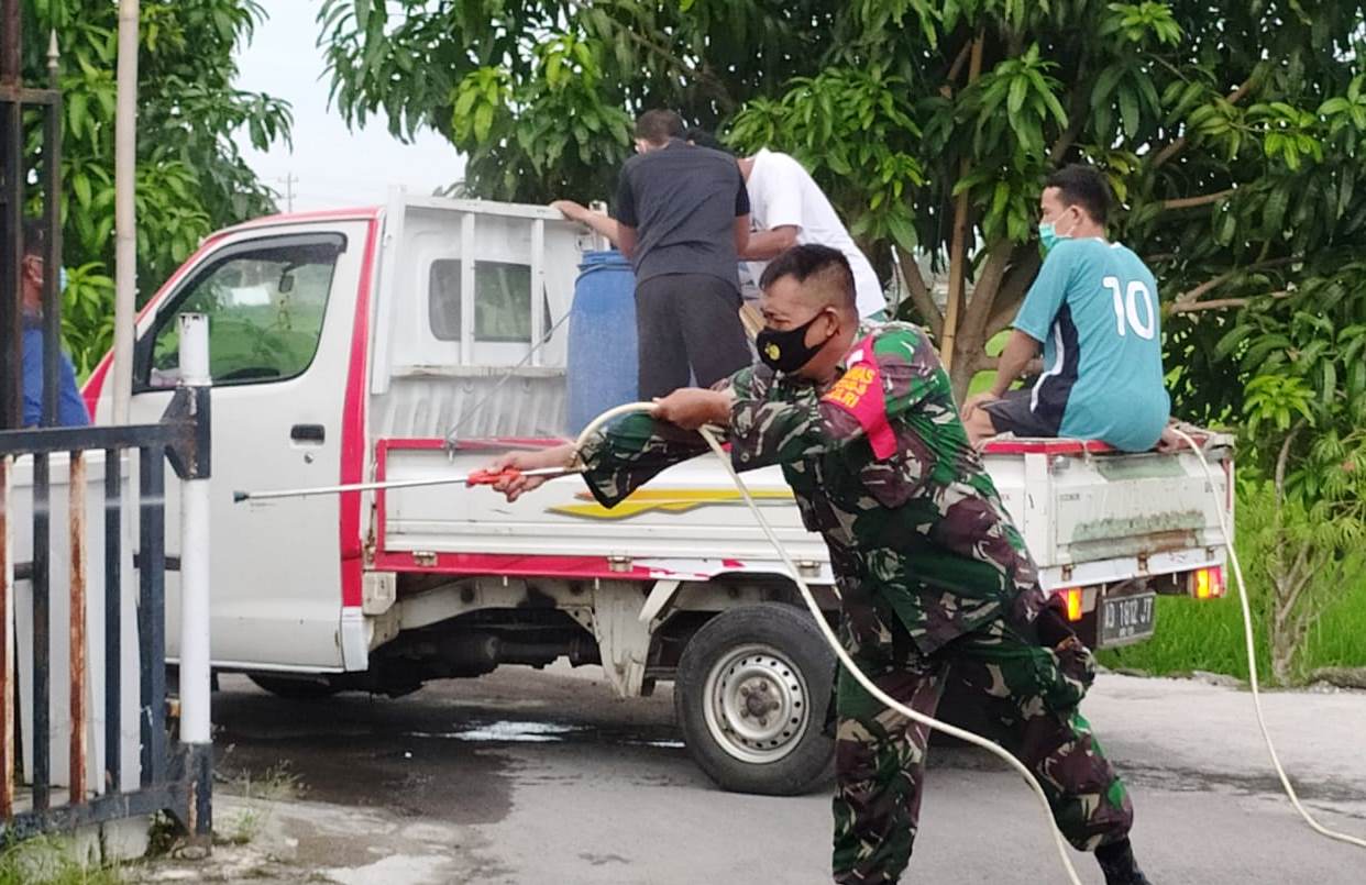 Minimalisir Penyebaran Covid-19 Babinsa Koramil 08/Baki Lakukan Penyemprotan Disinfektan
