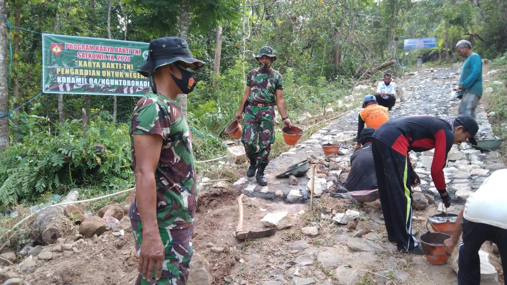 Anggota Koramil yang dipimpin langsung oleh Batuud Peltu Lutfi, bergotong-royong dengan warga dengan sasaran pengerasan jalan yang menghubungkan Dusun Bolo, Desa Bulurejo dengan Dusun Gubukan, Kelurahan Beji.