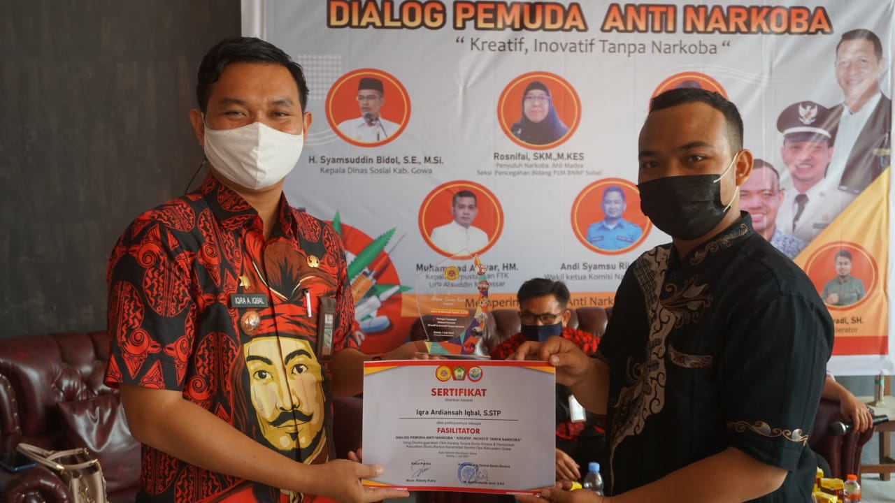Selanjutnya kegiatan ini dilanjutkan dengan “Dialog Pemuda Kreatif, Inovatif tanpa Narkoba” yang diisi oleh lima pemateri yakni Kadis Sosial Kab.Gowa Bapak H.Syamsuddin Bidol, SE.,M.Si, Penyuluh Narkoba Ahli Madya Seksi Pencegahan Bidang P2M BNNP Sulawesi Selatan Rosnifai, SKM., M.Kes., Anggota DPRD Kab.Gowa Fraksi PKS Bapak Asnawi Syam, Kepala Perpustakaan FTK UIN Alauddin Makassar Bapak Muh. Anwar, HM, Wakil Ketua Komisi Napza KNPI Gowa Bapak Andi Syamsu Rijal Sahib.