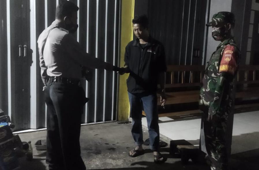 Anggota Koramil 24/Puhpelem Serda Tri Winarto, bersama anggota Polsek Bripka Munadi melaksanakan pendisiplinan protkes di ruas jalan utama Kecamatan Puhpelem, Jumat (9/7) malam