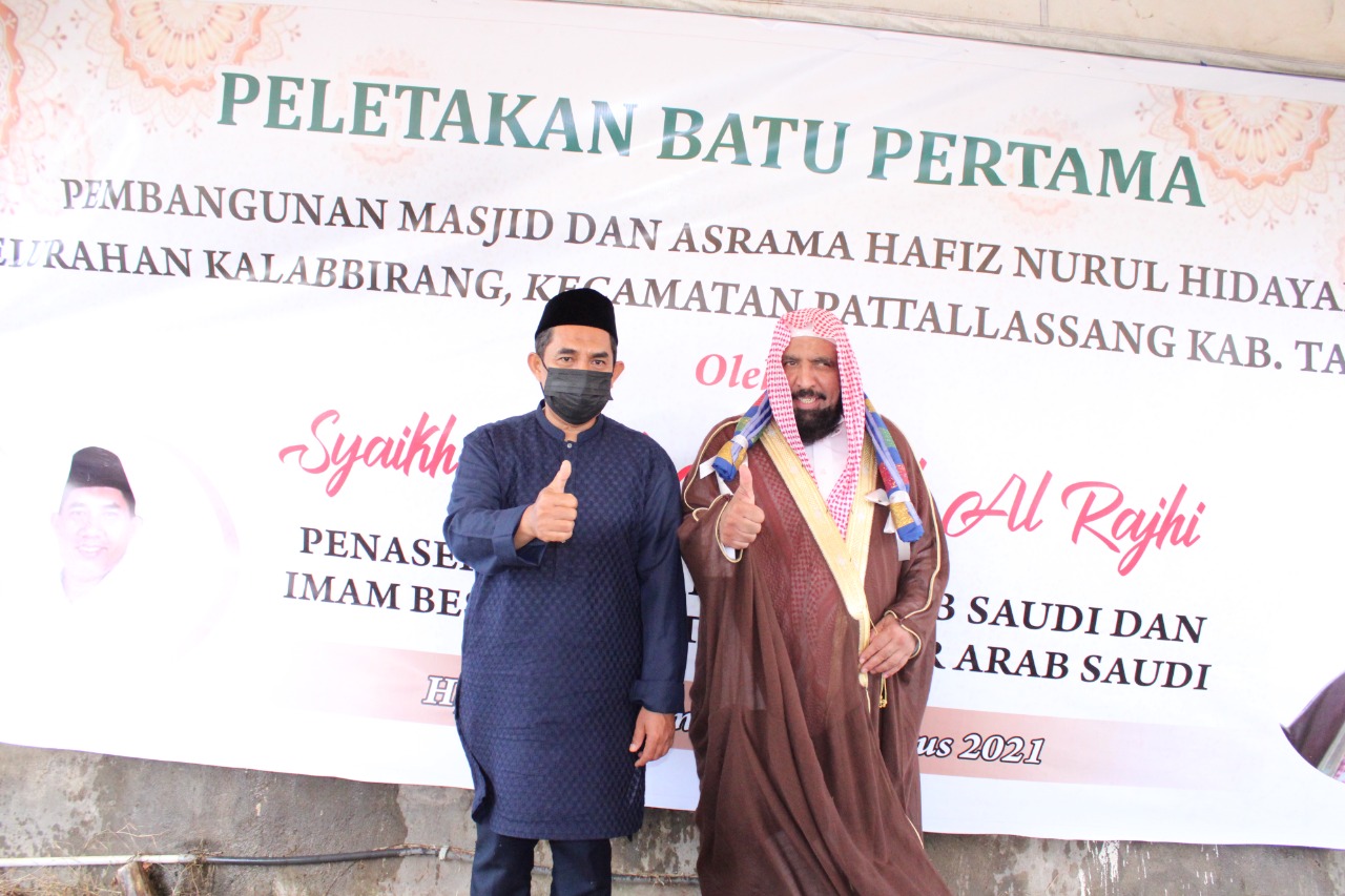 SULSELBERITA.COM || Penasehat duta besar Arab Saudi untuk Indonesia Syeikh Saleh Abdullah Al Rajhi meletakkan batu pertama pembangunan rumah tahfidz Al-Quran sekaligus renovasi masjid di Kelurahan Kalabbirang, Kecamatan Pattalassang.(Jumat, 27/8/2021)