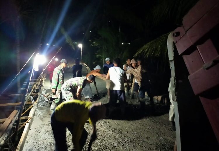 Kerja lembur TNI bersama warga yang hanya diterangi cahaya minim, tak membuat proses pengecoran terkendala. Bahkan sebaliknya, anggota bersama warga yang ikut membantu terlihat tambah antusias menyelesaikan pekerjaan.