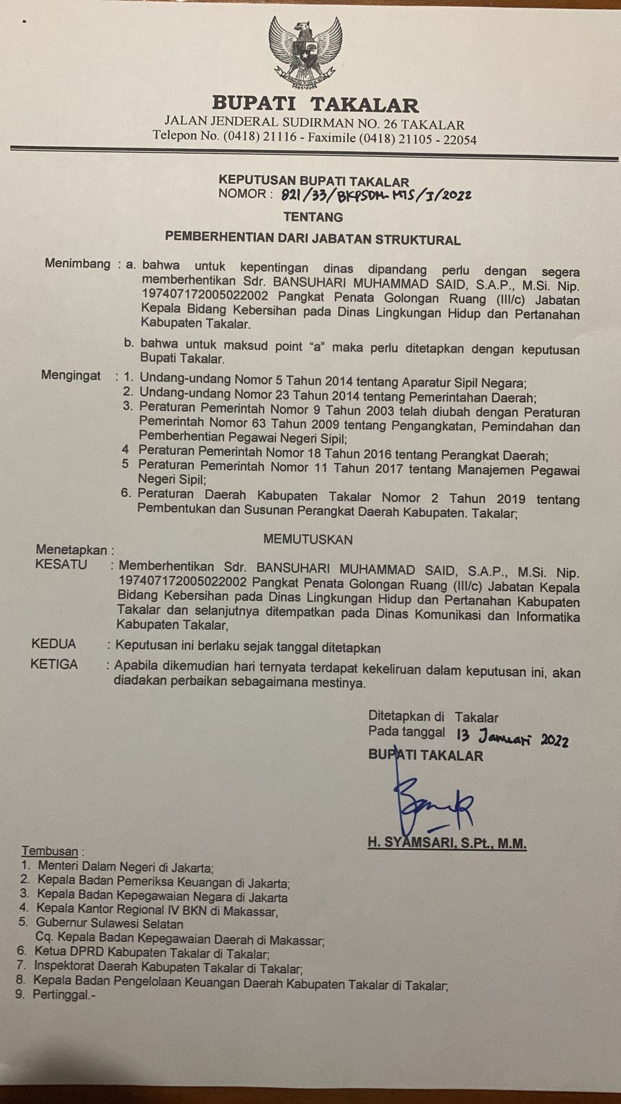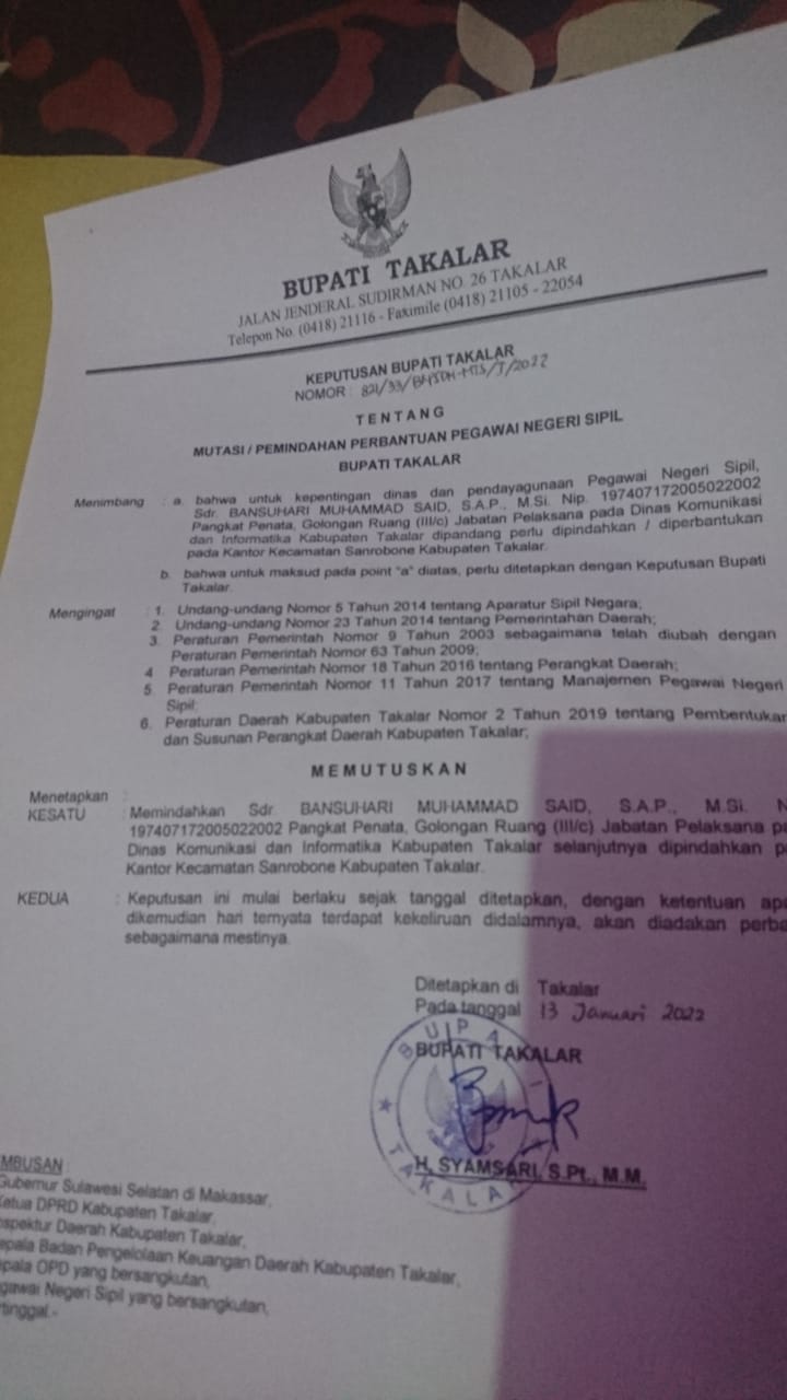 Adalah Bansuhari Said yang sebelumnya menjabat sebagai Kabid kebersihan Dinas Lingkungan Hidup Kab.Takalar masuk dalam daftar gerbong mutasi pada tanggal 13 Januari (berdasarkan SK mutasi), ke Dinas Kominfo.