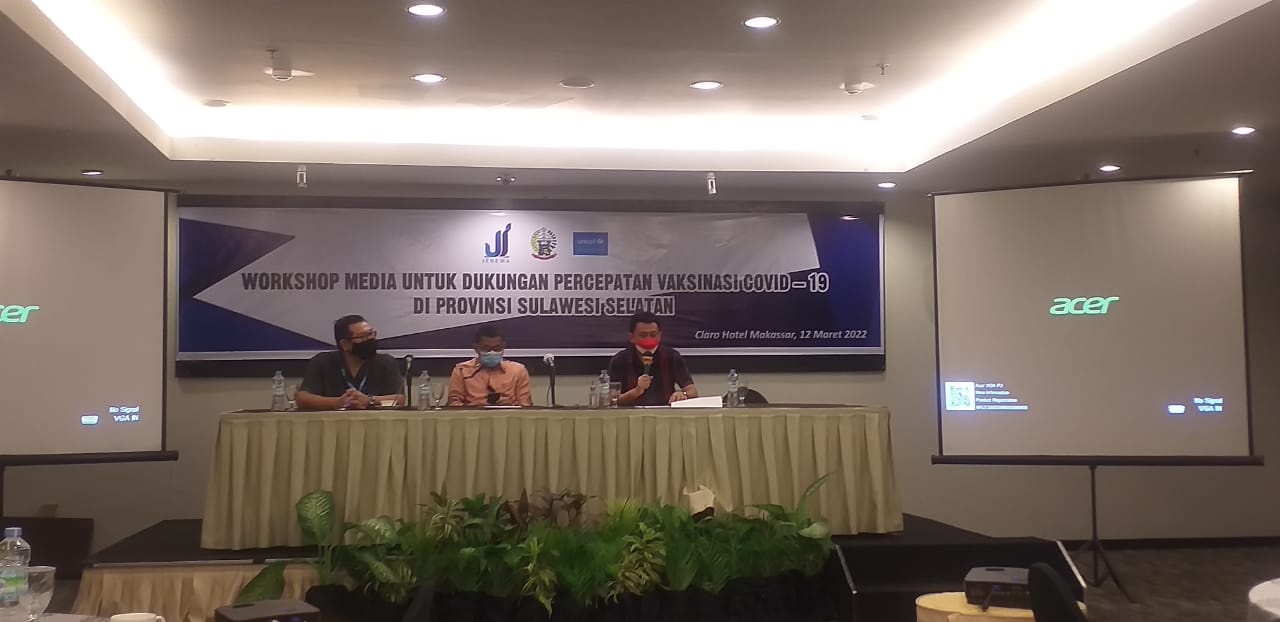 SULSELBERITA.COM. Makassar – Yayasan jenewa madani bekerjasama United Nations International Children’s Emergency Fund (UNICEF) menggelar workshop media untuk dukungan percepatan vaksinasi Covid-19 di Provinsi Sulawesi Selatan. Kegiatan ini diadakan di hotel Claro, Makassar (12/3/2022)