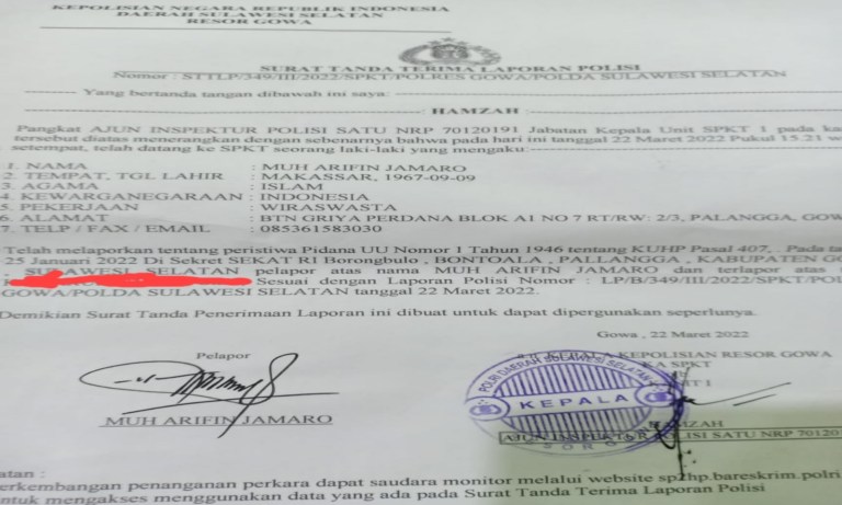 Menurutnya, Pengurus SEKAT RI telah melaporkan kejadian tersebut ke Polres Gowa dengan nomor LP/B/349/lll/2022/SPKT/Polres Gowa, Polda sulsel, tanggal 22 Maret.