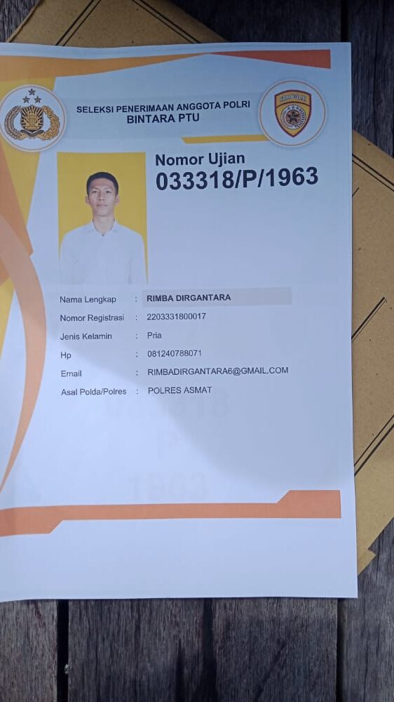 Datanya tidak terlalu banyak. Hanya selembar foto nomor ujian tes seleksi anggota Polri Bintara PTU yang kami peroleh. Rimba ternyata mengikuti seleksi  menjadi anggota Polri melalui Polres Asmat.