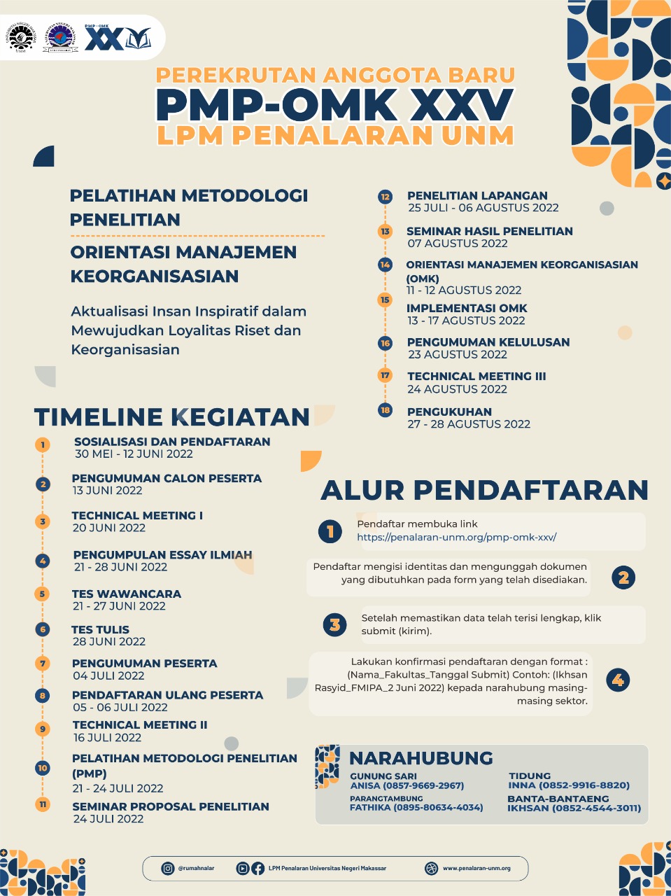 SULSELBERITA.COM. Makassar, — LPM Penalaran UNM menggelar sosialisasi dan Pendaftaran Pelatihan Metodologi Penelitian dan Orientasi Manajemen Keorganisasian XXV (PMP-OMK XXV) yang dimulai tanggal 30 Mei sampai 12 Juni 2022.