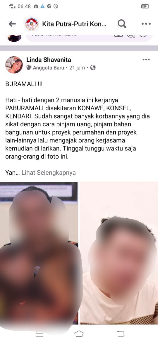 Hati Hati dengan 2 manusia ini kerjanya PABURAMALI disekitaran KONAWE,KONSEL,KENDARI. Sudah sangat banyak korbanya yang dia sikat dengan cara pinjam uang, pinjam bahan bangunan untuk proyek perumahan dan proyek lain lainya lalu mengajak orang kerja sama kemudian di larikan. Tinggal tunggu waktu Saja orang – orang di foto ini.”