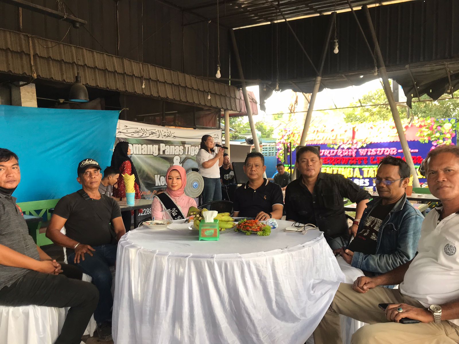 Karang bunga ucapan selamat itu tertulis ditujukan kepada Sekretaris Media Online Pewarta. co, Nia Herawati Lubis, S. Ak yang mengadakan syukuran atas wisudanya di Cafe Me And You, Jalan Jamin Ginting Simpang Selayang tersebut, Sabtu (2/7/2022).
