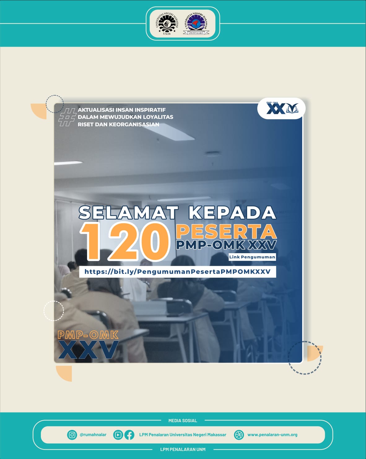 LPM Penalaran UNM mengumumkan peserta yang lolos seleksi daring dan berhak lanjut untuk mengikuti Pelatihan Metodologi Penelitian dan Orientasi Manajemen Keorganisasian XXV (PMP-OMK XXV). Selamat kepada peserta yang telah terpilih untuk mengikuti Pelatihan Metodologi Penelitian dan Orientasi Manajemen Keorganisasian angkatan XXV (PMP-OMK XXV). Hasil ini merupakan kerja keras kalian. Kalian telah membuktikan bahwa hasil tidak mengkhianati proses. Jangan menyia-nyiakan kesempatan ini untuk melangkah kearah yang lebih baik. Dan tetap optimis serta semangat terus.
