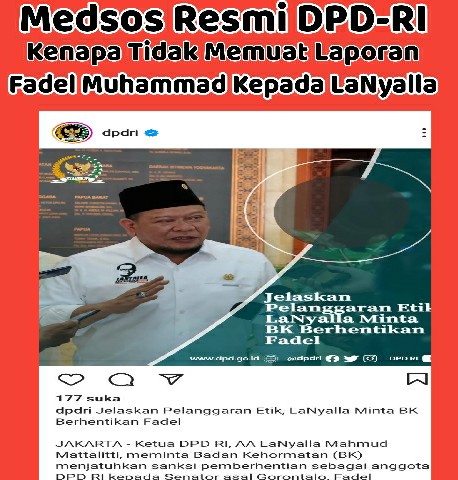 SULSELBERITA.COM. Jakarta – Publik Ketika Memperhatikan Akun Website Dpd.go.id dan Instagram dpdri yang merupakan akun medsos resmi milik DPD-RI sangatlah aneh dimana tidak ada Pernyataan ataupun Kegiatan Tugas Fadel Muhammad sebagai Anggota DPD-RI 2019-2024 dan juga menjabat Wakil Ketua MPR Yang di publikasikan di akun resmi Dpd-ri tersebut , Ada Apakah ini…??? Sebaliknya Materi Yang memuat desakan agar Fadel Muhammad diberhentikan , contohnya adalah pada Website Dpd.go.id tgl 29 september 2022 memuat berita “ Jelaskan Pelanggaran Etik, ; LaNyalla Minta BK Berhentikan Fadel “ dan juga konten di Instagram dpdri di tgl 30 september 2022 dengan judul yang sama “ Jelaskan Pelanggaran Etik, ;LaNyalla Minta BK Berhentikan Fadel “ tidak hanya itu yang lebih mengherankan lagi Instagram dpdri pada tgl 16 september 2022 memuat konten pernyataan dari “ Margarito kamis : Keputusan DPD-RI Soal Fadel Muhammad Legal dan harus ditindaklanjuti” ada hubungan apa pernyataan Margarito hingga harus dimuat dalam akun resmi milik Dpd-ri .