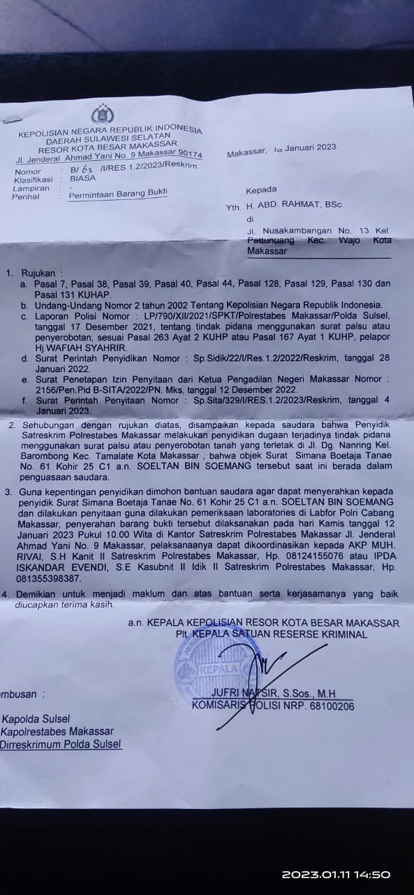 Berdasarkan panggilan polisi terkait surat panggilan polisi tertanggal Makassar, 10/1/2023, nomor surat : B/63/I/RES.1.2/2023/Reskrim, aji Beddu dimintai keterangan terkait surat rincik kepemilikan Ishak Hamzah terlapor atas laporan Hajjah wafiah Syahril, yang dibawah oleh aji Beddu dan tidak pernah dikembalikan.