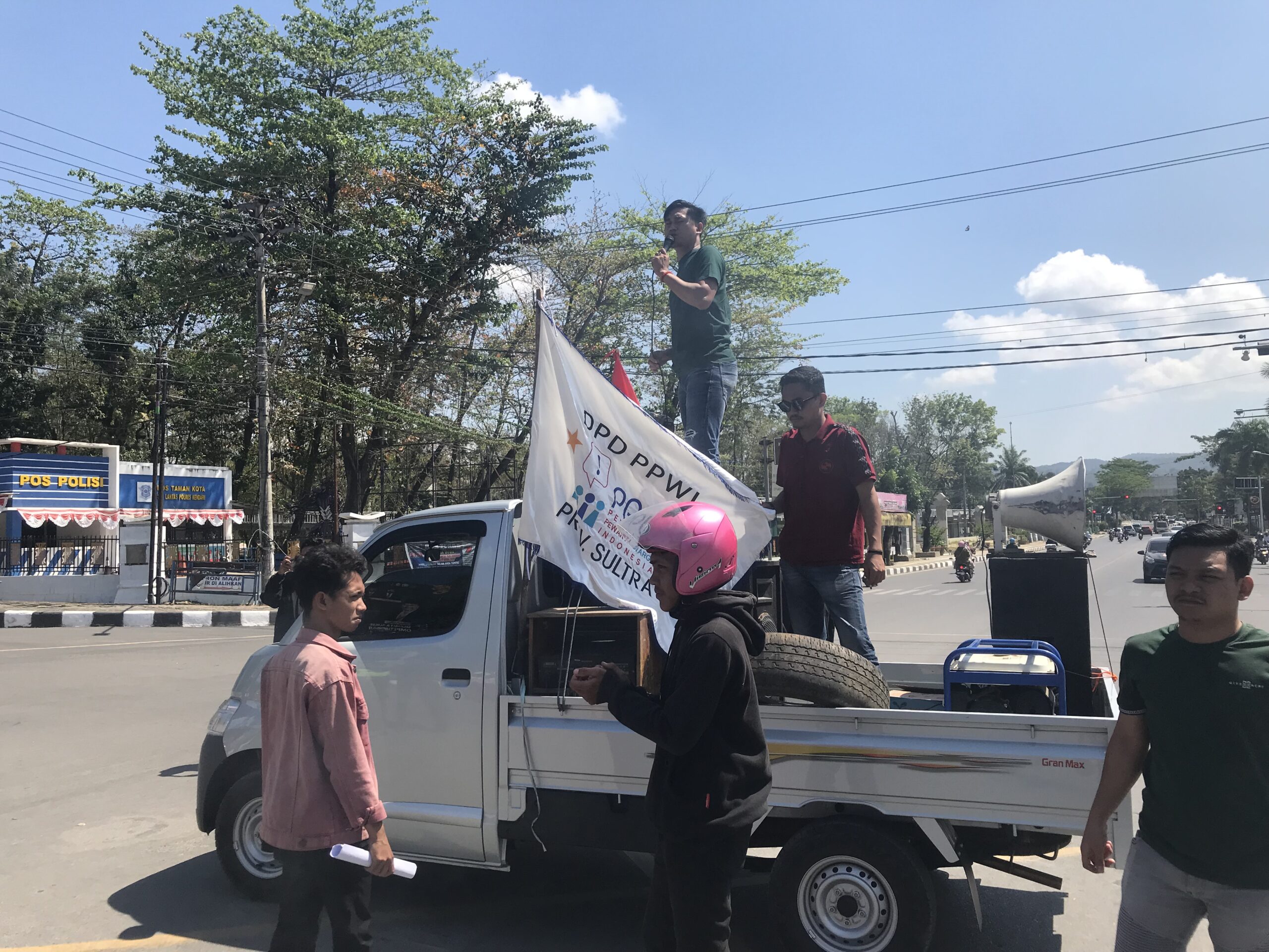 KENDARI – Persatuan Pewarta Warga Indonesia (PPWI) Sulawesi Tenggara (Sultra). Menggelar aksi unjuk rasa di kantor Kejaksaan Tinggi (Kejati) Sulawesi Tenggara (Sultra). Jumat (8/9/23)
