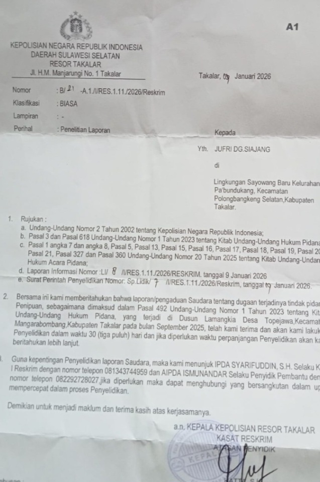 Diduga Lamban Tangani Laporan Penipuan Belasan Juta Rupiah, Kinerja Polres Takalar Disorot