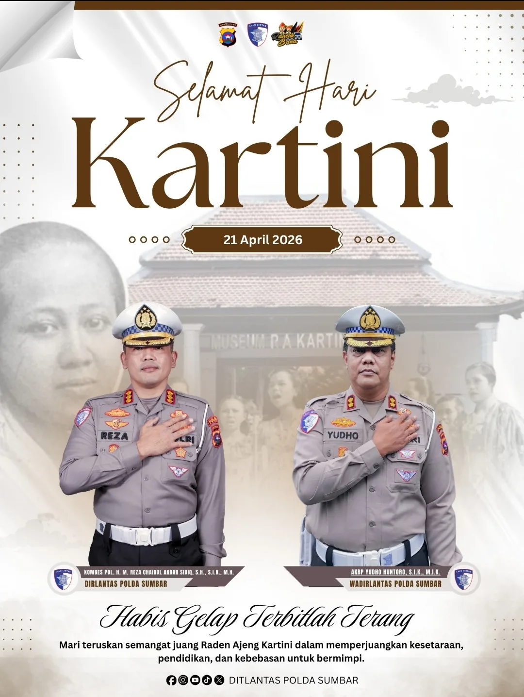 Dirlantas Polda Sumatera Barat, Kombes Pol. M.H. Reza Chairul Akbar Sidiq bersama Wadirlantas Polda Sumatera Barat, AKBP Yudho Huntoro, menyampaikan bahwa perjuangan Kartini bukan hanya catatan sejarah, melainkan inspirasi yang terus hidup hingga saat ini.