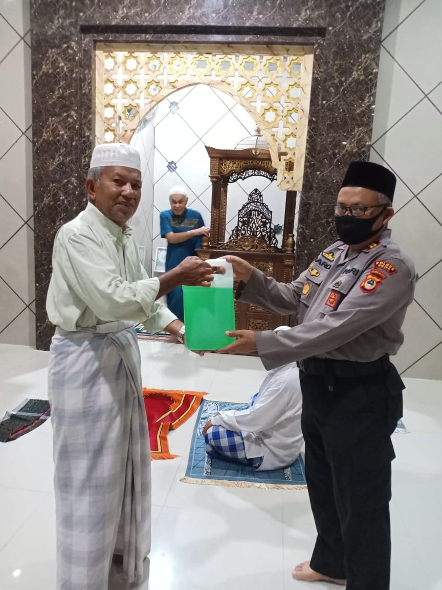 Safari Subuh, Kapolsek Bajeng Serahkan Hand Zanitizer ke Pengurus Mesjid At Taqwa Pammase