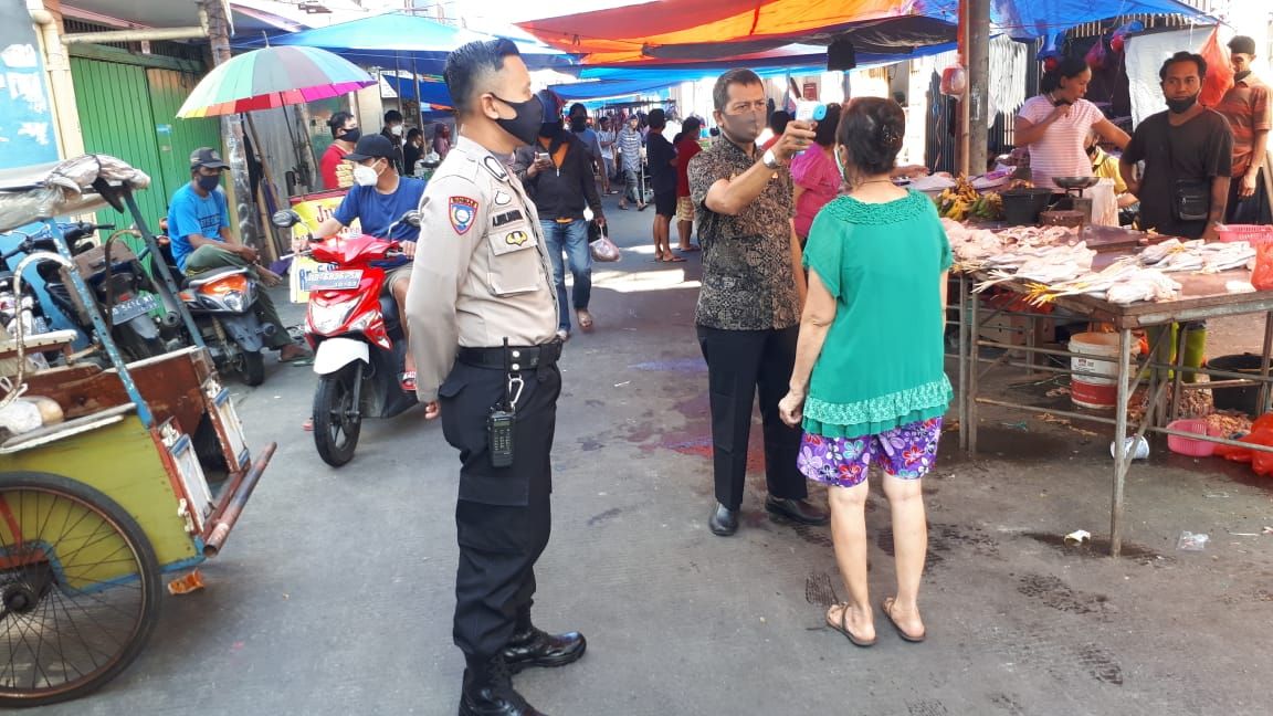 Pantau Aktivitas Pasar, Bhabinkamtibmas Bersama Lurah Melayu Baru Lakukan Pengukuran Suhu Tubuh