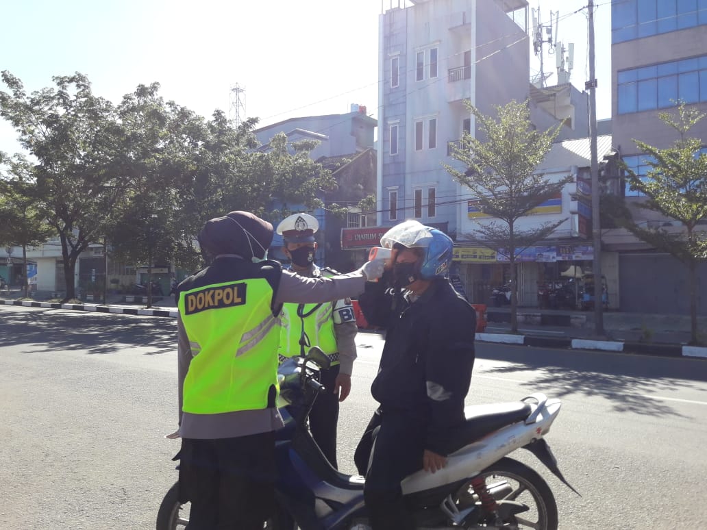 Urkes polres Pelabuhan Makassar, Cek Suhu Tubuh Pengguna Jalan di Posko Covid Zona 4 Makassar